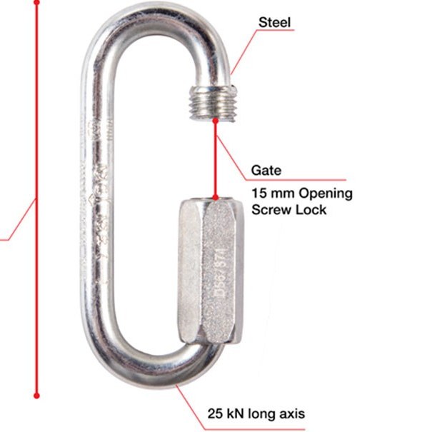 جنس فولادی این کارابین با روکش گالوانیزه، مقاومت بالایی در برابر خوردگی و فشار های محیطی دارد و با سیستم قفل پیچی، اتصالی ایمن و مطمئن را تضمین می کند. قدرت تحمل بار در محور اصلی ۲۵ کیلونیوتن و در محور فرعی ۱۰ کیلونیوتن است که نشان دهنده ظرفیت بالای آن در برابر نیرو های سنگین است. دهانه ۱۶ میلی متری این کارابین، امکان اتصال به تسمه ها، طناب هایا تجهیزات دیگر را به راحتی فراهم می کند و شکل بیضی آن، بار را به صورت متعادل توزیع می کند.