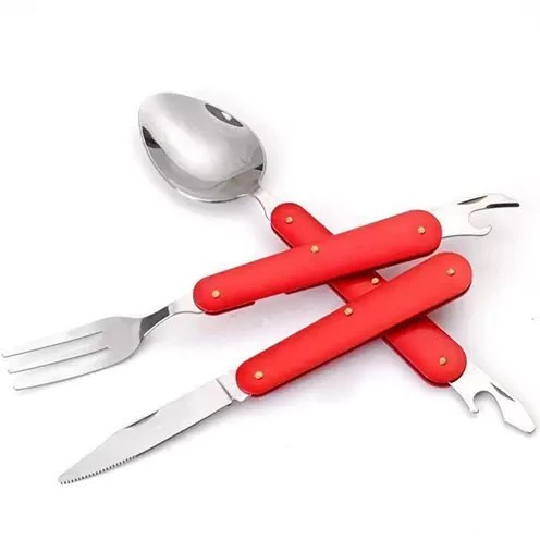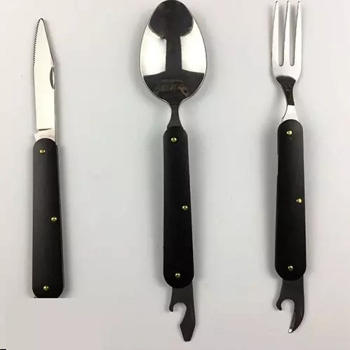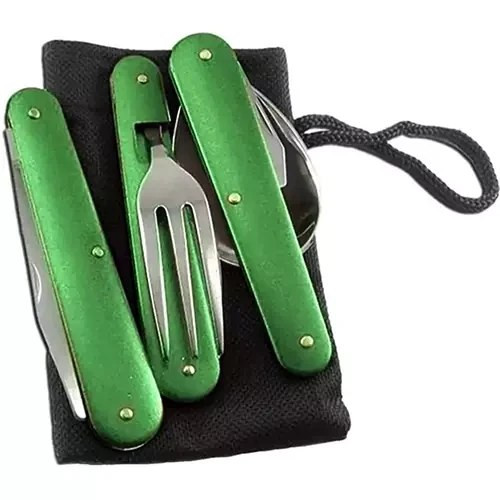 ویژگی: 1 عدد قاشق با درب بازکن، 1 عدد چنگال با درب بازکن، 1 عدد کارد.کیف برزنتی با امکان آویز کردن روی کوله