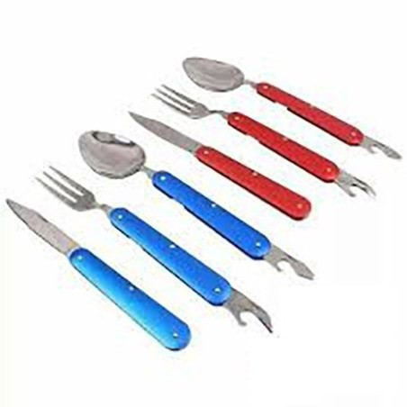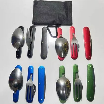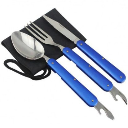 1 عدد قاشق با درب بازکن، 1 عدد چنگال با درب بازکن، 1 عدد کارد.کیف برزنتی با امکان آویز کردن روی کوله